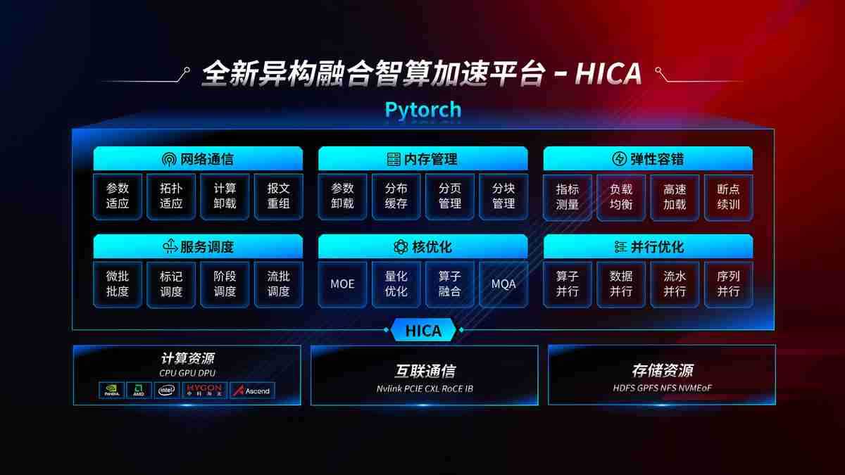通过自研的服务层、、中间适配层、、、、以及调度编排算法,,,采用数据并行、、、、模型并行等多种并行方式,,,,把并行计算任务进行有效的分解,,使其分别由相应的软件栈和算力资源来承接。。当GPU资源变化,,,,HICA可以实时动态调度计算子任务并调整模型拓扑和架构,,,,以充分聚合各种算力资源。。。。