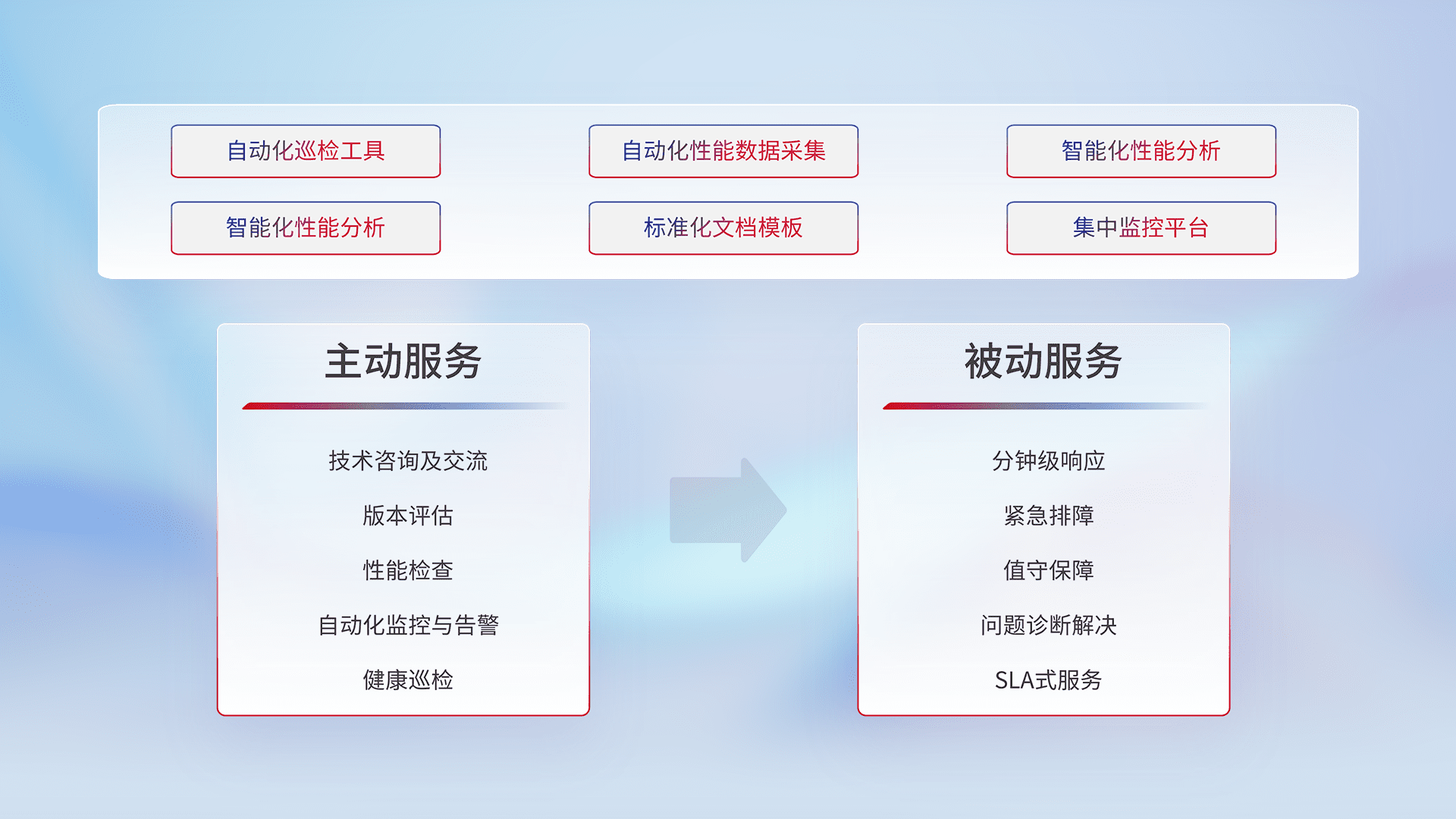 智能化工具和标准化文档,,保障服务质量,,,,提供主动服务(包含技术咨询、、版本评估、、、、性能检查、、自动化监控与告警、、健康巡检)和被动服务包含(分钟级响应、、紧急排障、、、值守保障、、、、问题诊断解决、、、、SLA服务)。。。。